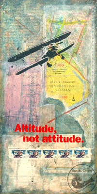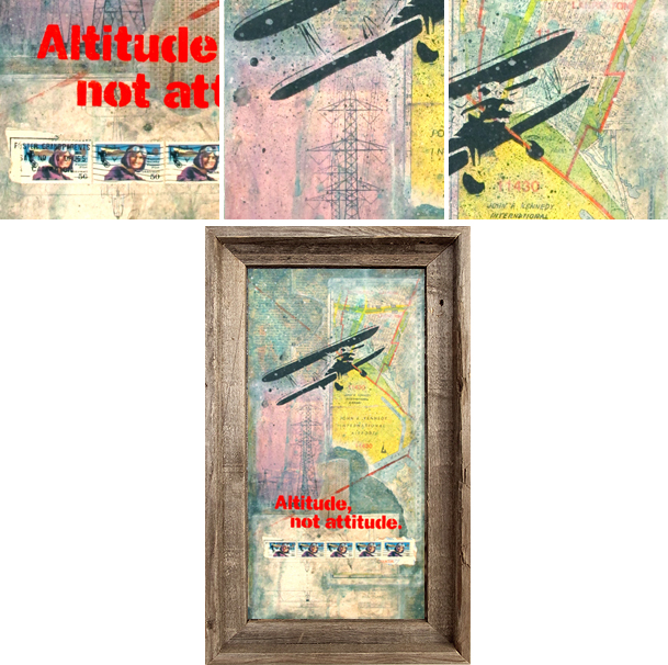 Nice messgae, isn't it? I found this old magazine clip that said "Altitude Not Attitude" in my image file. When I saw it, I knew I wanted to create an image with flight as a theme. So I put it together with a map of JFK Airport, a drafting of Sikorsky plane, and transmission towers. But I desperately needed more. Vintage airplane and Postal stamps of Harriet Quimby were no-brainer. I cut a stencil for "Altitude Not Atitude" and splay painted. Voila! Fly High, Folks!
